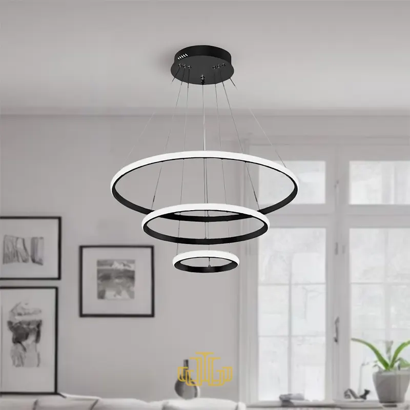 یک لوستر مدرن با طراحی سه حلقهای که ظاهری ساده و شیک دارد. مناسب برای دکوراسیونهای معاصر، با نوردهی نرم و هماهنگ در فضاهای مختلف.